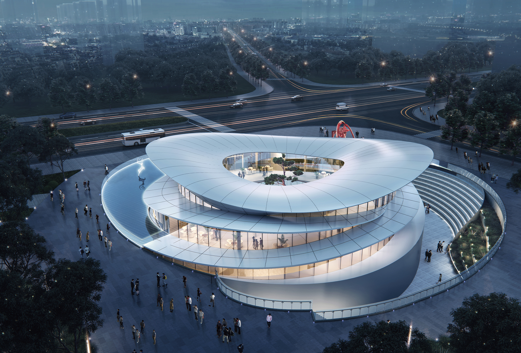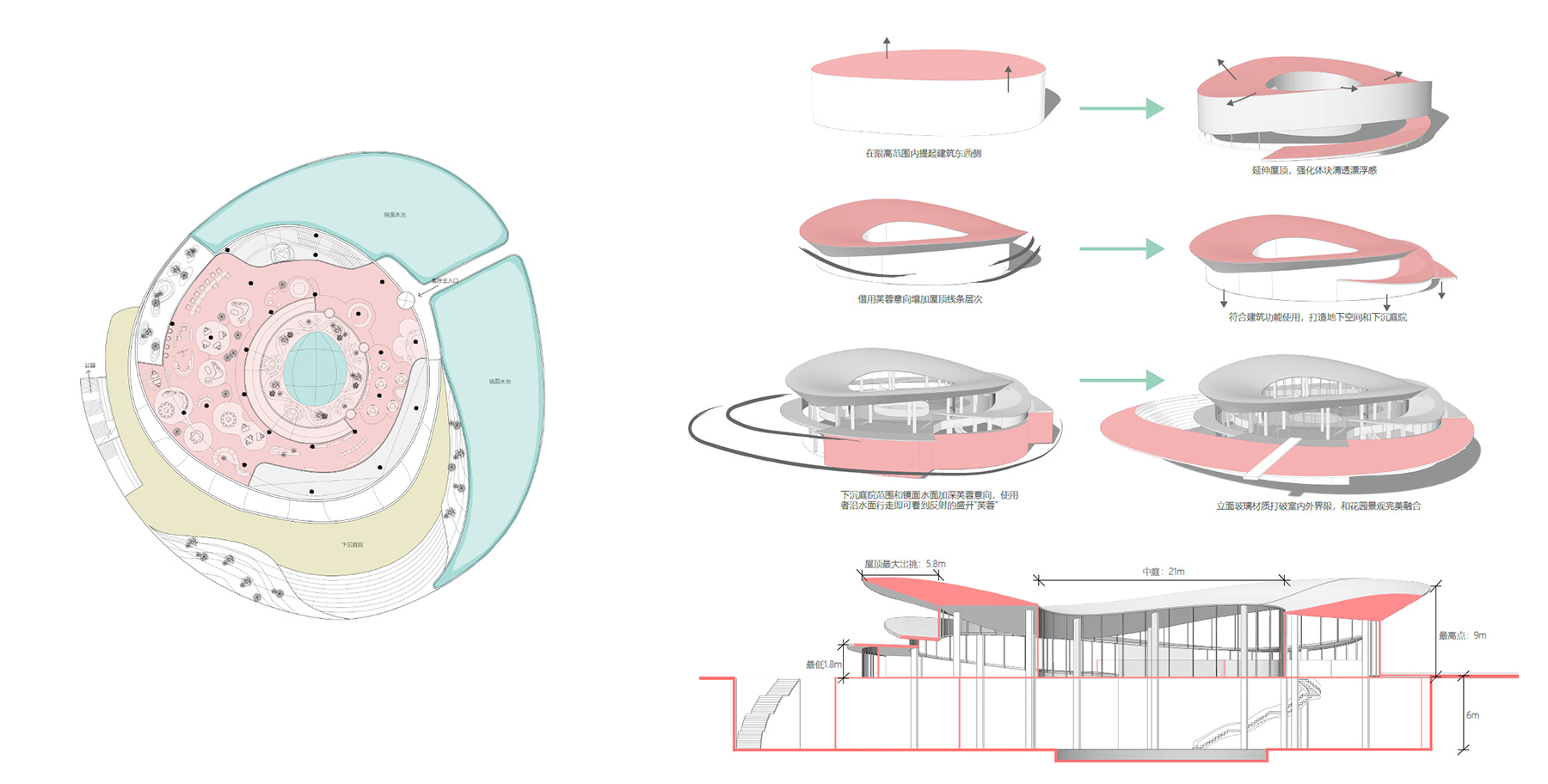 曲江,前有著名的大唐芙蓉园,后有美丽的曲江池。曲江城市展厅设计概念便源于“清水出芙蓉“,与曲江悠久的园林历史遥相呼应。曲水流觞,交织穿过公园景观中的亮点小品,引景观线条最终汇聚于东南角的展厅,似出水芙蓉,既是步入公园最佳的起点,也是延续西侧学校地块传承的“开花结果”。曲水流觞,交织穿过公园景观中的亮点小品,引景观线条最终汇聚于东南角的展厅,似出水芙蓉,既是步入公园最佳的起点,也是延续西侧学校地块传承的“开花结果”。